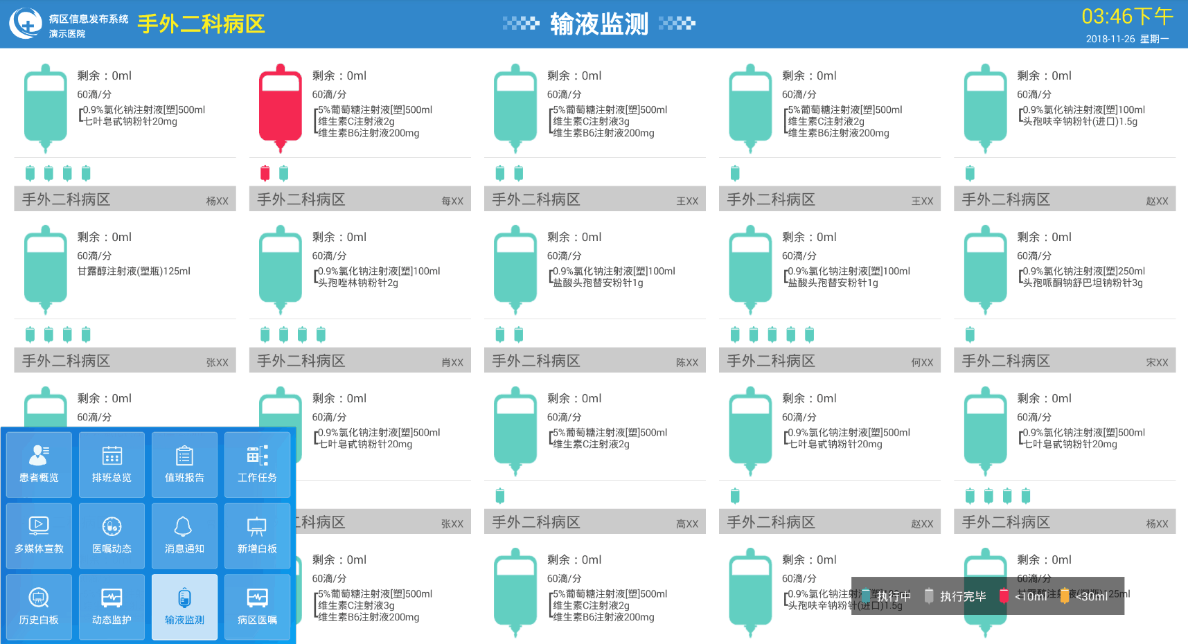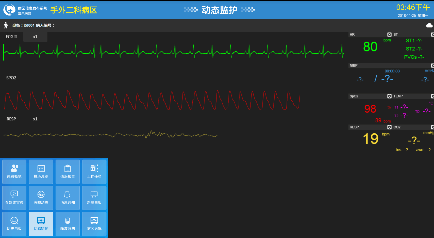 通過(guò)對(duì)接院內(nèi)物聯(lián)網(wǎng)設(shè)備動(dòng)態(tài)顯示監(jiān)護(hù)數(shù)據(jù),如心電監(jiān)護(hù)儀、輸液泵、輸液秤等。