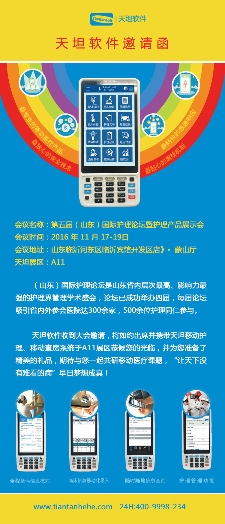 天坦軟件恭祝“第五屆(山東)國(guó)際護(hù)理論壇暨護(hù)理產(chǎn)品展示會(huì)”如期舉辦并取得圓滿成功,也期待這一次行業(yè)的交流盛會(huì)的到來,共同學(xué)習(xí)、共同進(jìn)步。天坦軟件將于A11展臺(tái)前恭候您的光臨。