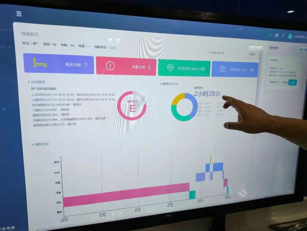 除了輸液外,患者的生命體征和運(yùn)動(dòng)軌跡也是醫(yī)護(hù)人員需要時(shí)刻操心的問題。智慧病房搭建智能在床實(shí)時(shí)監(jiān)測系統(tǒng),在床墊下放置了傳感器,可以精準(zhǔn)測量和傳輸患者的生命體征、睡眠、離床等數(shù)據(jù),一旦數(shù)據(jù)異?;蛘呋颊唛L時(shí)間不在監(jiān)測范圍內(nèi),系統(tǒng)會自動(dòng)進(jìn)行異常或離床、跌落等警報(bào),可以及時(shí)避免意外事件發(fā)生。